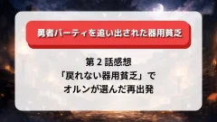 また、ヴェロニカという“もう一つの未来”を体現するサキュバスが登場したことで、リルイの生き方の選択肢が一気に広がりました。ドSで小悪魔的でありながらも、同じ種族としてリルイの資質をすばやく見抜き、命を張って守る姿には、彼女なりの愛情がにじんでいます。中年冒険者ハジメと、したたかなサキュバス・ヴェロニカという、異なる価値観の大人に挟まれながら、リルイがこれから自分の「居場所」と「生き方」をどう選んでいくのか。第2話はそのプロローグのような回だった、と私は感じました。